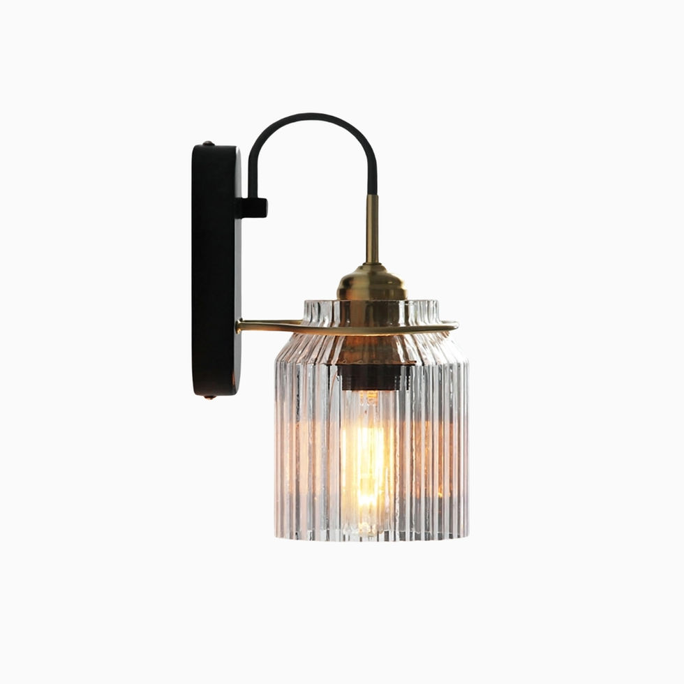 The Agapi wall light tempers industrial forms with a softened glow, filtering illumination through a vertically ribbed glass shade. Its deliberate geometry and rich material contrast — blackened mount, burnished brass armature, and clear prismatic glass — lend it weight without dominance. This is a piece that works in slow gestures, inviting the eye without interrupting the room.